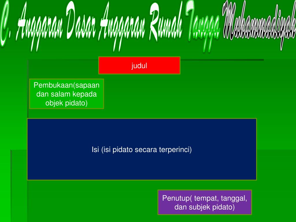 C. AnggaranDasarAnggaranRumahTanggaMuhammadiyah judul Pembukaan(sapaandansalamkepadaobjekpidato) Isi (isipidatosecaraterperinci) Penutup( tempat, tanggal, dansubjekpidato)