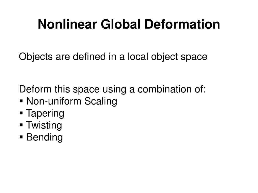 Nonlinear Global Deformation Objects are defined in a local object space • Deform this space using a combination of: • Non-uniform Scaling • Tapering • Twisting • Bending