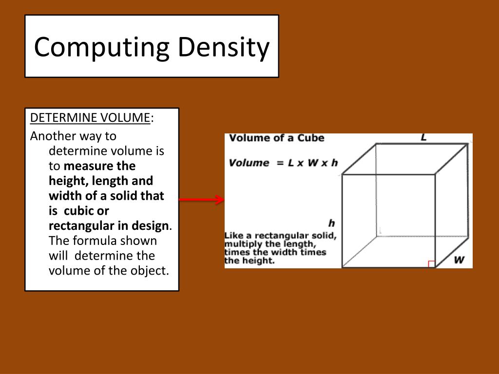 Computing Density DETERMINE VOLUME: Another way to determine volume is to measure the height, length and width of a solid that is cubic or rectangular in design. The formula shown will determine the volume of the object.