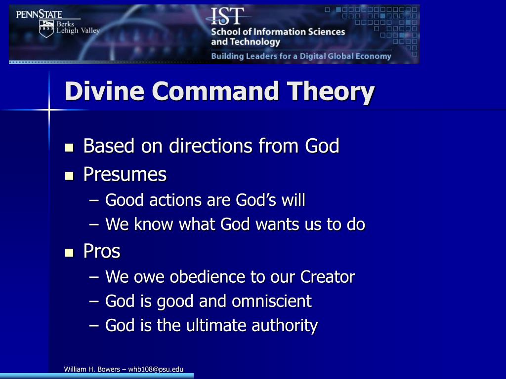 Divine Command Theory • Based on directions from God • Presumes • Good actions are God’s will • We know what God wants us to do • Pros • We owe obedience to our Creator • God is good and omniscient • God is the ultimate authority William H. Bowers – whb108@psu.edu