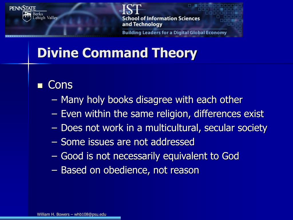 Divine Command Theory • Cons • Many holy books disagree with each other • Even within the same religion, differences exist • Does not work in a multicultural, secular society • Some issues are not addressed • Good is not necessarily equivalent to God • Based on obedience, not reason William H. Bowers – whb108@psu.edu