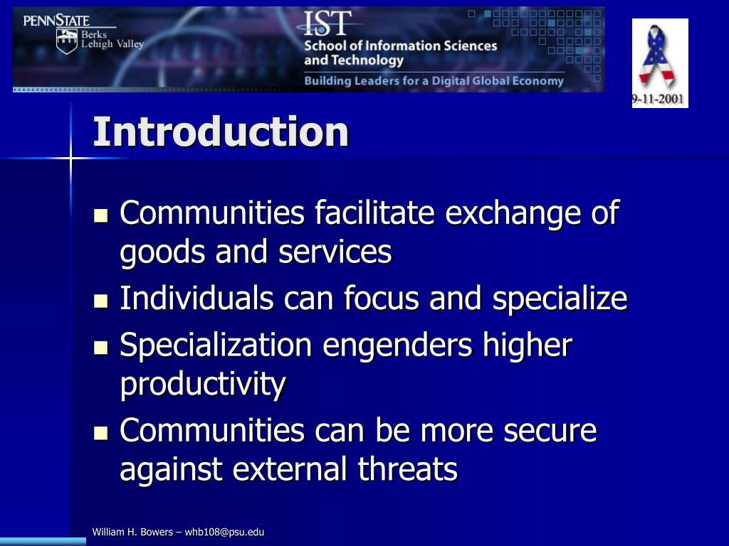 Introduction • Communities facilitate exchange of goods and services • Individuals can focus and specialize • Specialization engenders higher productivity • Communities can be more secure against external threats William H. Bowers – whb108@psu.edu