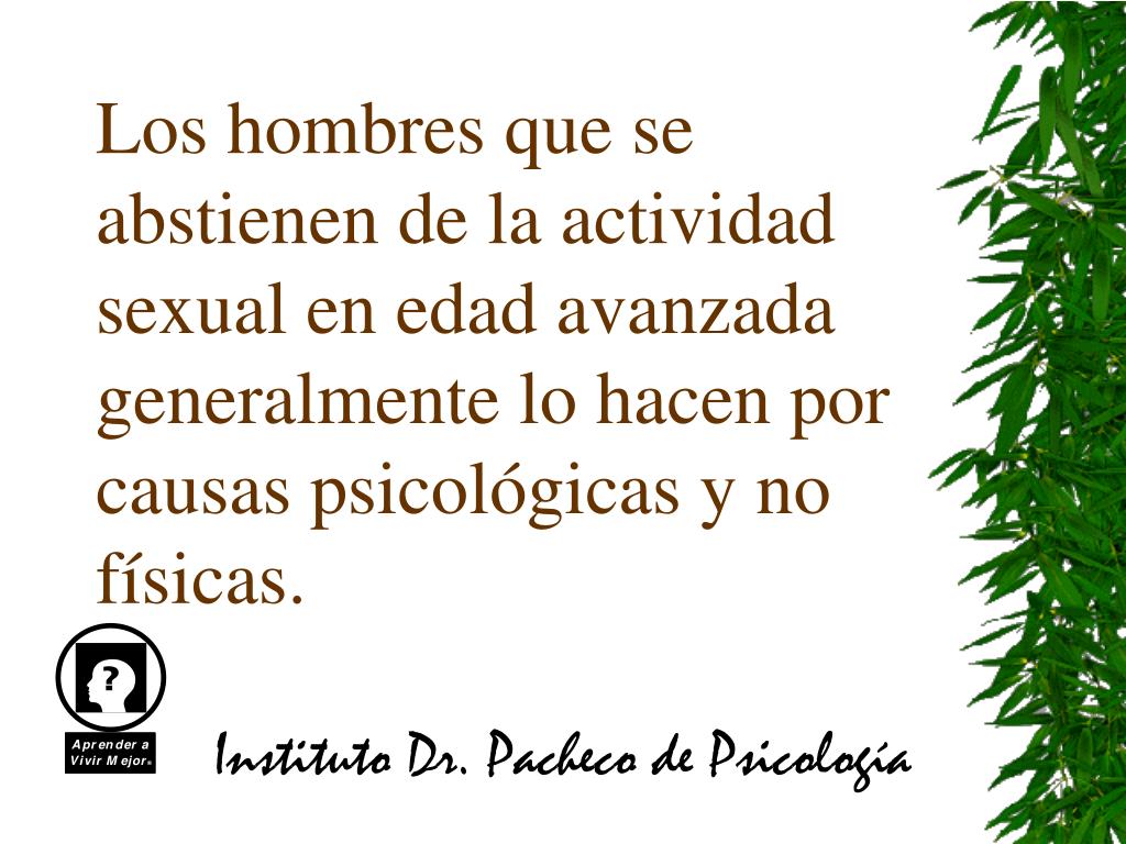 Los hombres que se abstienen de la actividad sexual en edad avanzada generalmente lo hacen por causas psicológicas y no físicas. Instituto Dr. Pacheco de Psicología