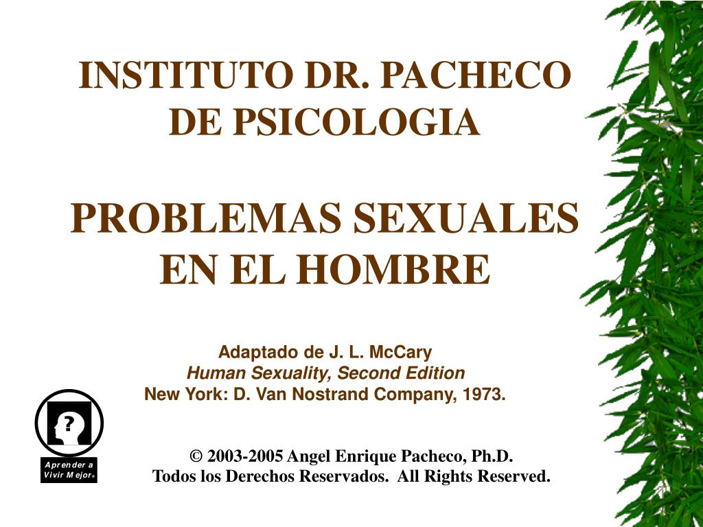 INSTITUTO DR. PACHECODE PSICOLOGIAPROBLEMAS SEXUALESEN EL HOMBREAdaptado de J. L. McCaryHuman Sexuality, Second EditionNew York: D. Van Nostrand Company, 1973. © 2003-2005 Angel Enrique Pacheco, Ph.D. Todos los Derechos Reservados. All Rights Reserved.