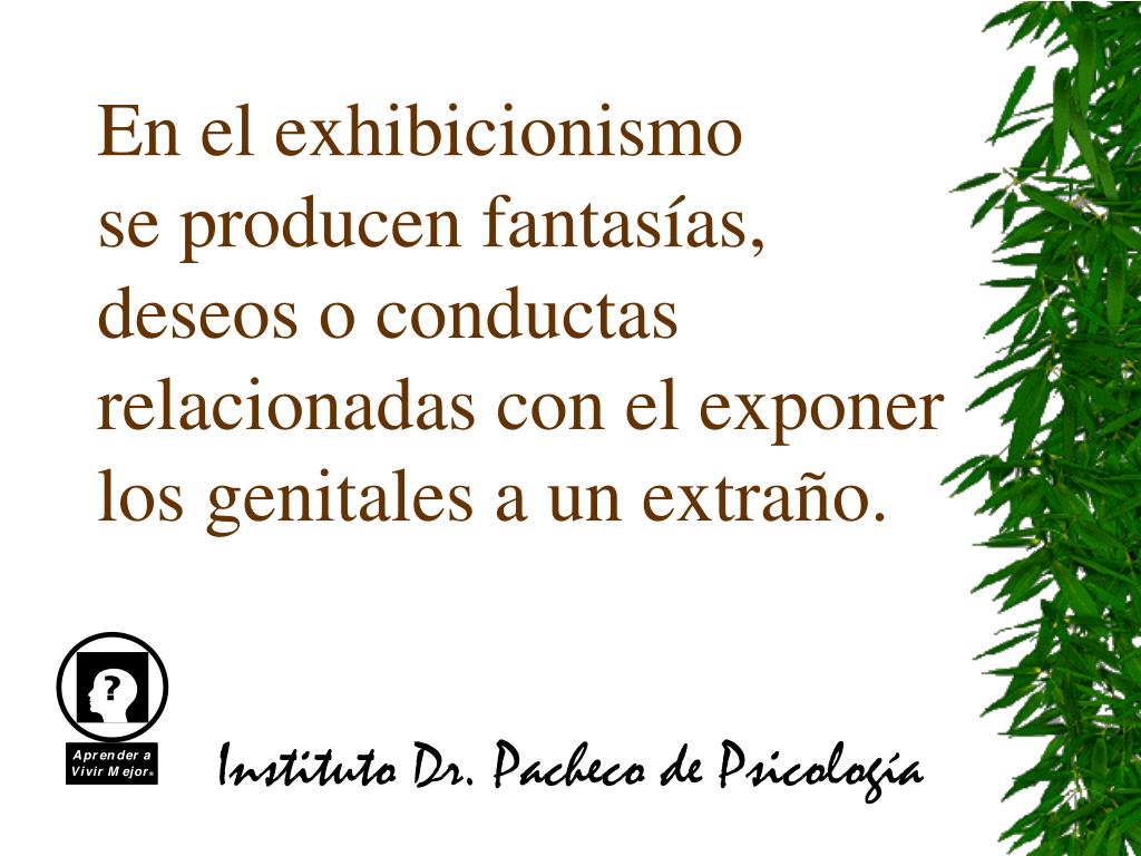 En el exhibicionismose producen fantasías, deseos o conductas relacionadas con el exponer los genitales a un extraño. Instituto Dr. Pacheco de Psicología