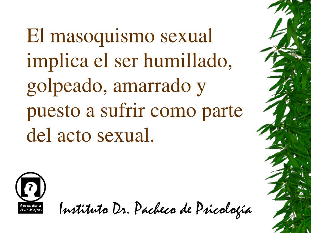 El masoquismo sexual implica el ser humillado, golpeado, amarrado y puesto a sufrir como parte del acto sexual. Instituto Dr. Pacheco de Psicología