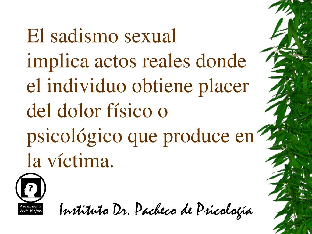 El sadismo sexualimplica actos reales donde el individuo obtiene placer del dolor físico o psicológico que produce en la víctima. Instituto Dr. Pacheco de Psicología