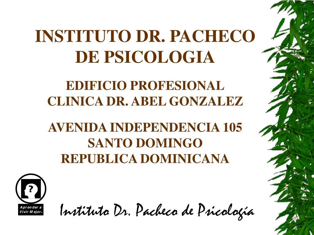 INSTITUTO DR. PACHECODE PSICOLOGIAEDIFICIO PROFESIONALCLINICA DR. ABEL GONZALEZAVENIDA INDEPENDENCIA 105SANTO DOMINGOREPUBLICA DOMINICANA Instituto Dr. Pacheco de Psicología