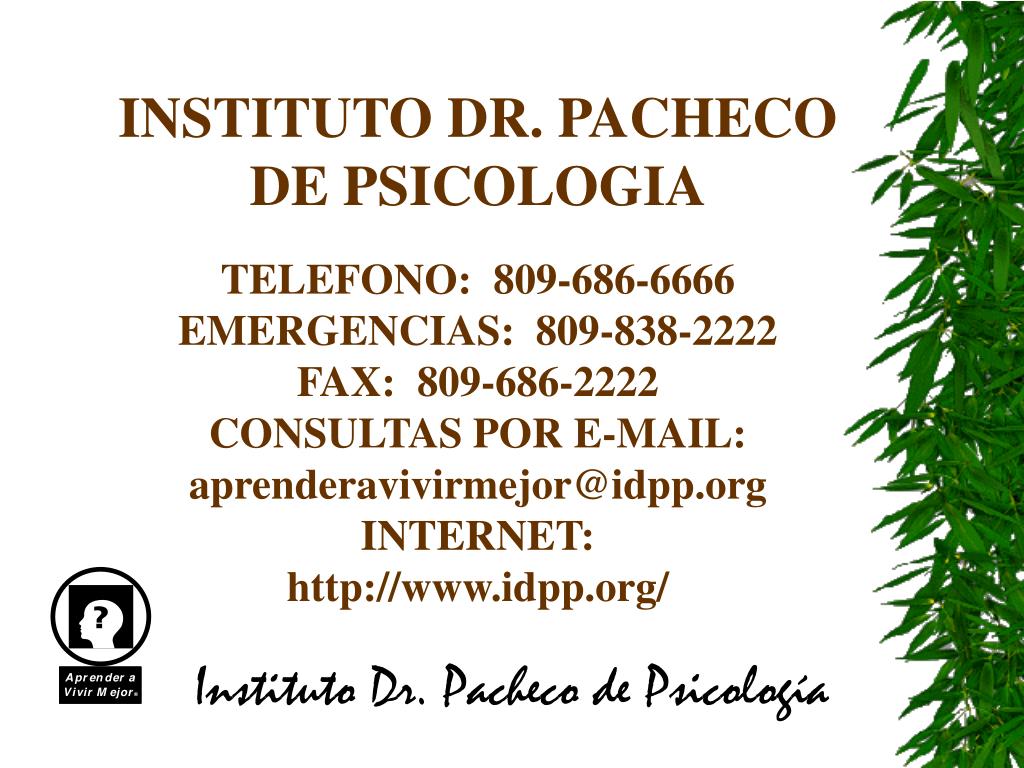 INSTITUTO DR. PACHECODE PSICOLOGIATELEFONO: 809-686-6666EMERGENCIAS: 809-838-2222FAX: 809-686-2222CONSULTAS POR E-MAIL: aprenderavivirmejor@idpp.orgINTERNET: http://www.idpp.org/ Instituto Dr. Pacheco de Psicología