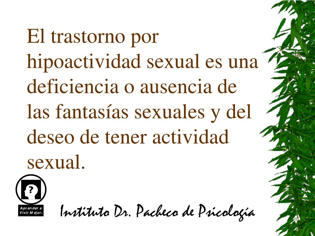 El trastorno por hipoactividad sexual es una deficiencia o ausencia de las fantasías sexuales y del deseo de tener actividad sexual. Instituto Dr. Pacheco de Psicología