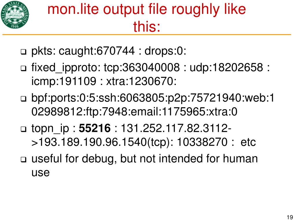 mon.lite output file roughly like this: • pkts: caught:670744 : drops:0: • fixed_ipproto: tcp:363040008 : udp:18202658 : icmp:191109 : xtra:1230670: • bpf:ports:0:5:ssh:6063805:p2p:75721940:web:102989812:ftp:7948:email:1175965:xtra:0 • topn_ip : 55216 : 131.252.117.82.3112->193.189.190.96.1540(tcp): 10338270 : etc • useful for debug, but not intended for human use