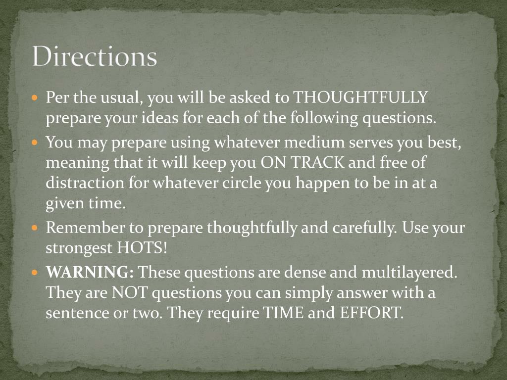 Directions • Per the usual, you will be asked to THOUGHTFULLY prepare your ideas for each of the following questions. • You may prepare using whatever medium serves you best, meaning that it will keep you ON TRACK and free of distraction for whatever circle you happen to be in at a given time. • Remember to prepare thoughtfully and carefully. Use your strongest HOTS! • WARNING: These questions are dense and multilayered. They are NOT questions you can simply answer with a sentence or two. They require TIME and EFFORT.