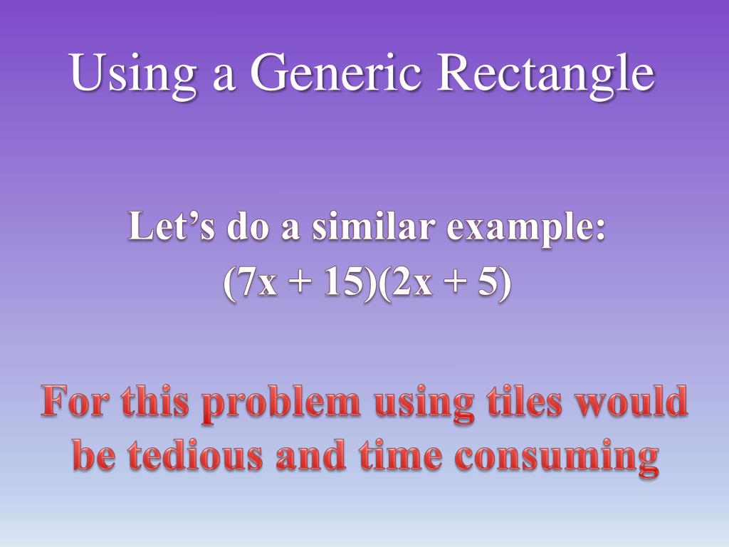 Using a Generic Rectangle Let’s do a similar example: (7x + 15)(2x + 5) For this problem using tiles would be tedious and time consuming
