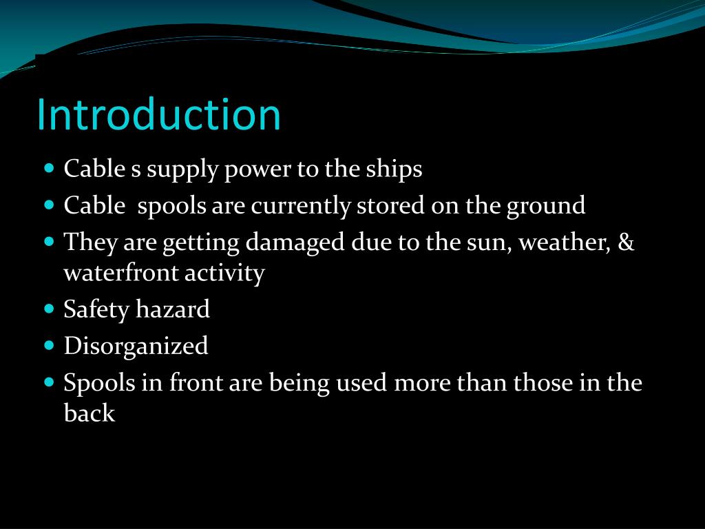 Introduction • Cable s supply power to the ships • Cable spools are currently stored on the ground • They are getting damaged due to the sun, weather, & waterfront activity • Safety hazard • Disorganized • Spools in front are being used more than those in the back