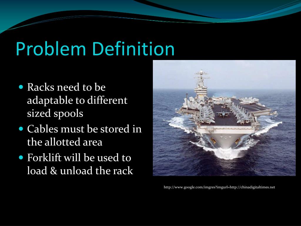 Problem Definition • Racks need to be adaptable to different sized spools • Cables must be stored in the allotted area • Forklift will be used to load & unload the rack http://www.google.com/imgres?imgurl=http://chinadigitaltimes.net