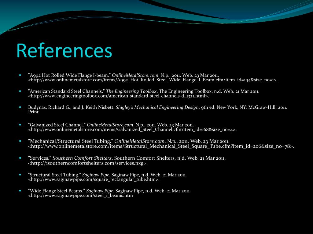 References • "A992 Hot Rolled Wide Flange I-beam." OnlineMetalStore.com. N.p., 2011. Web. 23 Mar 2011. <http://www.onlinemetalstore.com/items/A992_Hot_Rolled_Steel_Wide_Flange_I_Beam.cfm?item_id=194&size_no=1>. • "American Standard Steel Channels." The Engineering Toolbox. The Engineering Toolbox, n.d. Web. 21 Mar 2011. <http://www.engineeringtoolbox.com/american-standard-steel-channels-d_1321.html>. • Budynas, Richard G., and J. Keith Nisbett. Shigley's Mechanical Engineering Design. 9th ed. New York, NY: McGraw-Hill, 2011. Print. • "Galvanized Steel Channel." OnlineMetalStore.com. N.p., 2011. Web. 23 Mar 2011. <http://www.onlinemetalstore.com/items/Galvanized_Steel_Channel.cfm?item_id=168&size_no=4>. • "Mechanical/Structural Steel Tubing." OnlineMetalStore.com. N.p., 2011. Web. 23 Mar 2011. <http://www.onlinemetalstore.com/items/Structural_Mechanical_Steel_Square_Tube.cfm?item_id=206&size_no=78>. • "Services." Southern Comfort Shelters. Southern Comfort Shelters, n.d. Web. 21 Mar 2011. <http://1southerncomfortshelters.com/services.nxg>. • "Structural Steel Tubing." Saginaw Pipe. Saginaw Pipe, n.d. Web. 21 Mar 2011. <http://www.saginawpipe.com/square_rectangular_tube.htm>. • "Wide Flange Steel Beams." Saginaw Pipe. Saginaw Pipe, n.d. Web. 21 Mar 2011. <http://www.saginawpipe.com/steel_i_beams.htm>.