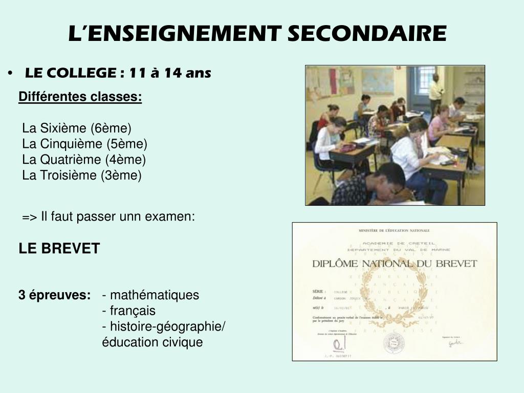 L’ENSEIGNEMENT SECONDAIRE Différentes classes: La Sixième (6ème) La Cinquième (5ème) La Quatrième (4ème) La Troisième (3ème) • LE COLLEGE : 11 à 14 ans => Il faut passer unn examen: LE BREVET 3 épreuves: - mathématiques - français - histoire-géographie/ éducation civique