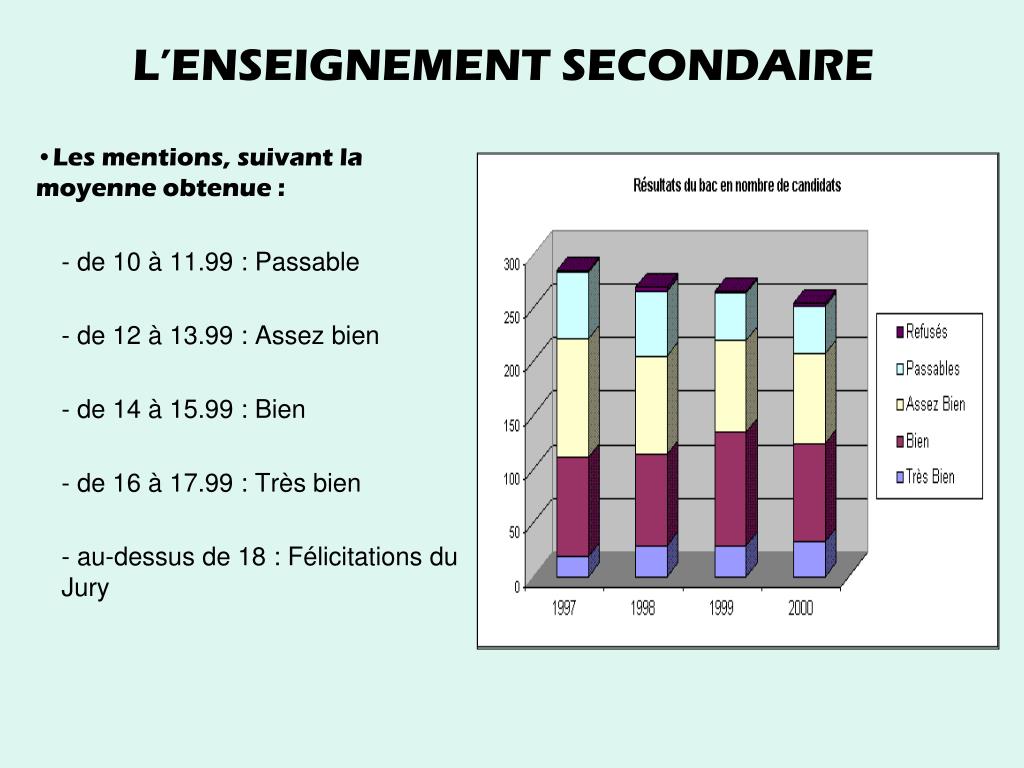 L’ENSEIGNEMENT SECONDAIRE • Les mentions, suivant la moyenne obtenue : • de 10 à 11.99 : Passable • de 12 à 13.99 : Assez bien • de 14 à 15.99 : Bien • de 16 à 17.99 : Très bien - au-dessus de 18 : Félicitations du Jury