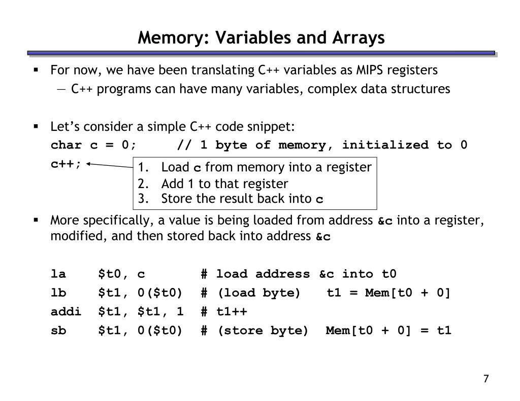 Load c from memory into a register • Add 1 to that register • Store the result back into c Memory: Variables and Arrays • For now, we have been translating C++ variables as MIPS registers • C++ programs can have many variables, complex data structures • Let’s consider a simple C++ code snippet: char c = 0; // 1 byte of memory, initialized to 0 c++; • More specifically, a value is being loaded from address &c into a register, modified, and then stored back into address &c la $t0, c # load address &c into t0 lb $t1, 0($t0) # (load byte) t1 = Mem[t0 + 0] addi $t1, $t1, 1 # t1++ sb $t1, 0($t0) # (store byte) Mem[t0 + 0] = t1