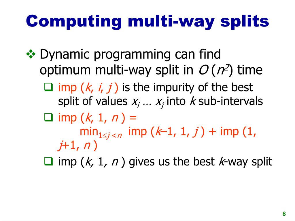 Computing multi-way splits • Dynamic programming can find optimum multi-way split in O (n2) time • imp (k, i, j ) is the impurity of the best split of values xi … xj into k sub-intervals • imp (k, 1, n ) = min1j <n imp (k–1, 1, j ) + imp (1, j+1, n ) • imp (k, 1, n ) gives us the best k-way split
