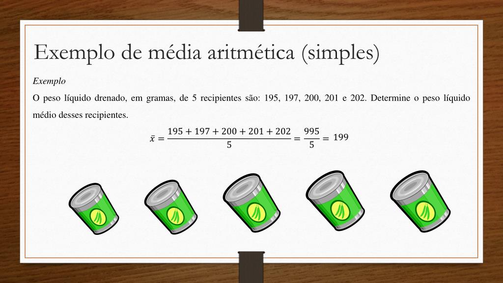 Exemplo de média aritmética (simples) Exemplo O peso líquido drenado, em gramas, de 5 recipientes são: 195, 197, 200, 201 e 202. Determine o peso líquido médio desses recipientes.