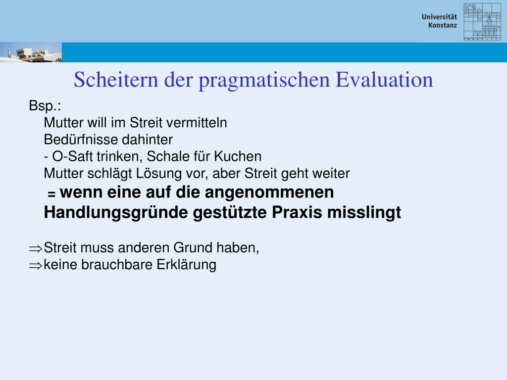 Scheitern der pragmatischen Evaluation Bsp.:Mutter will im Streit vermittelnBedürfnisse dahinter- O-Saft trinken, Schale für KuchenMutter schlägt Lösung vor, aber Streit geht weiter= wenn eine auf die angenommenen Handlungsgründe gestützte Praxis misslingt • Streit muss anderen Grund haben, • keine brauchbare Erklärung