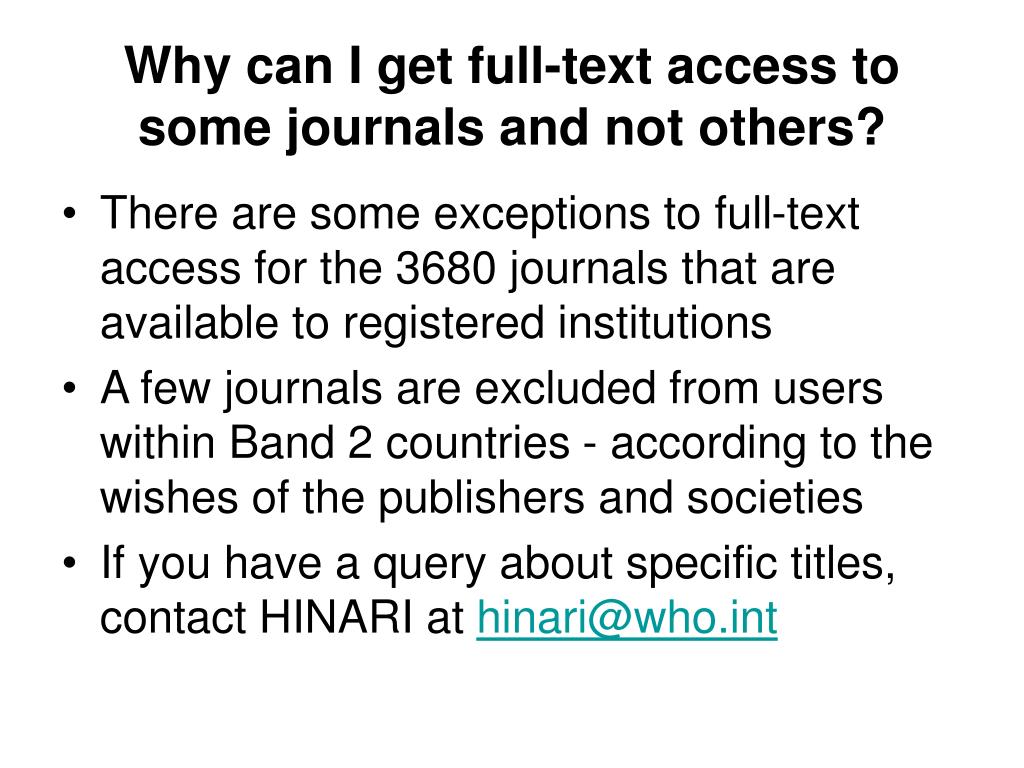 Why can I get full-text access to some journals and not others? • There are some exceptions to full-text access for the 3680 journals that are available to registered institutions • A few journals are excluded from users within Band 2 countries - according to the wishes of the publishers and societies • If you have a query about specific titles, contact HINARI at hinari@who.int