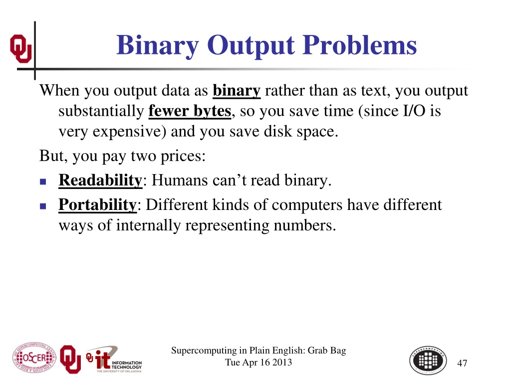 Binary Output Problems When you output data as binary rather than as text, you output substantially fewer bytes, so you save time (since I/O is very expensive) and you save disk space. But, you pay two prices: • Readability: Humans can’t read binary. • Portability: Different kinds of computers have different ways of internally representing numbers. Supercomputing in Plain English: Grab Bag Tue Apr 16 2013