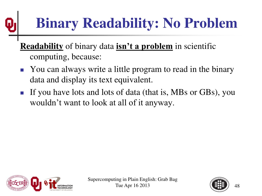 Binary Readability: No Problem Readability of binary data isn’t a problem in scientific computing, because: • You can always write a little program to read in the binary data and display its text equivalent. • If you have lots and lots of data (that is, MBs or GBs), you wouldn’t want to look at all of it anyway. Supercomputing in Plain English: Grab Bag Tue Apr 16 2013