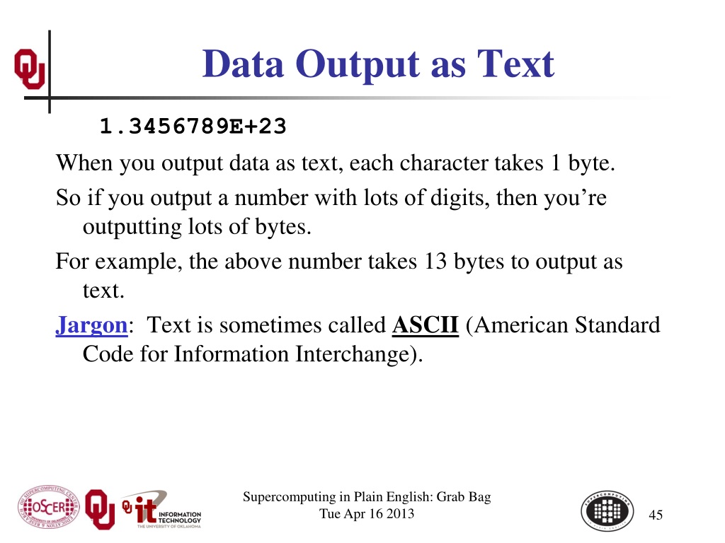 Data Output as Text 1.3456789E+23 When you output data as text, each character takes 1 byte. So if you output a number with lots of digits, then you’re outputting lots of bytes. For example, the above number takes 13 bytes to output as text. Jargon: Text is sometimes called ASCII (American Standard Code for Information Interchange). Supercomputing in Plain English: Grab Bag Tue Apr 16 2013
