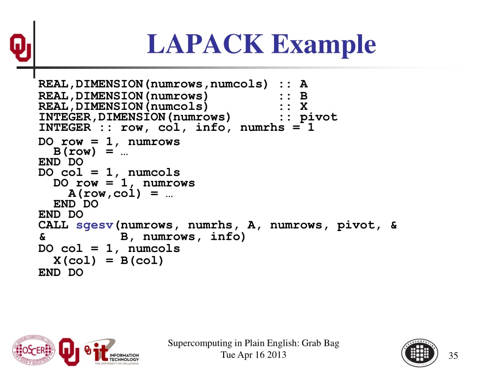 LAPACK Example REAL,DIMENSION(numrows,numcols) :: A REAL,DIMENSION(numrows) :: B REAL,DIMENSION(numcols) :: X INTEGER,DIMENSION(numrows) :: pivot INTEGER :: row, col, info, numrhs = 1 DO row = 1, numrows B(row) = … END DO DO col = 1, numcols DO row = 1, numrows A(row,col) = … END DO END DO CALL sgesv(numrows, numrhs, A, numrows, pivot, & & B, numrows, info) DO col = 1, numcols X(col) = B(col) END DO Supercomputing in Plain English: Grab Bag Tue Apr 16 2013