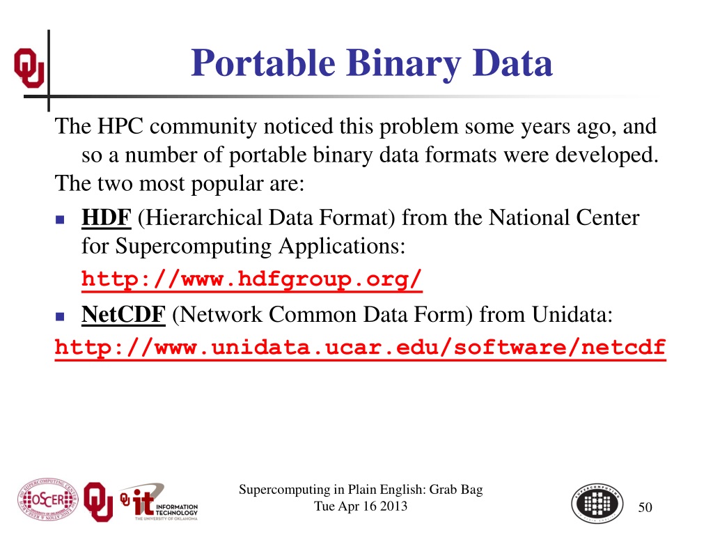 Portable Binary Data The HPC community noticed this problem some years ago, and so a number of portable binary data formats were developed. The two most popular are: • HDF (Hierarchical Data Format) from the National Center for Supercomputing Applications: http://www.hdfgroup.org/ • NetCDF (Network Common Data Form) from Unidata: http://www.unidata.ucar.edu/software/netcdf Supercomputing in Plain English: Grab Bag Tue Apr 16 2013