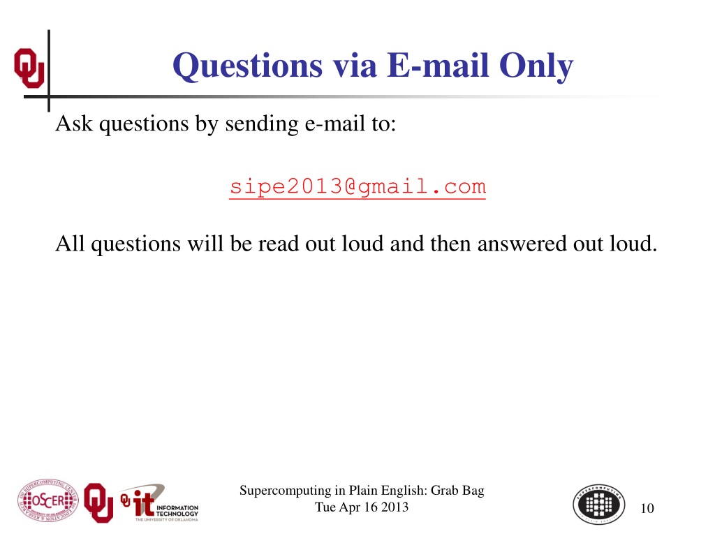 Questions via E-mail Only Ask questions by sending e-mail to: sipe2013@gmail.com All questions will be read out loud and then answered out loud. Supercomputing in Plain English: Grab Bag Tue Apr 16 2013