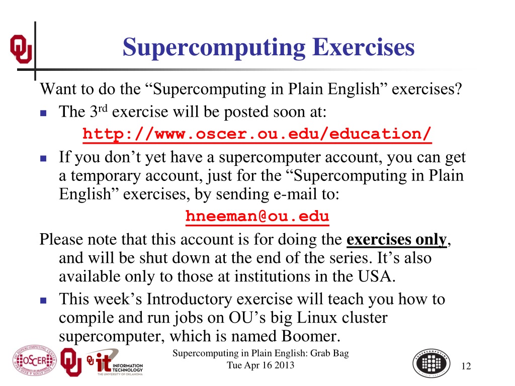 Supercomputing Exercises #2 You’ll be doing the exercises on your own (or you can work with others at your local institution if you like). These aren’t graded, but we’re available for questions: hneeman@ou.edu Supercomputing in Plain English: Grab Bag Tue Apr 16 2013