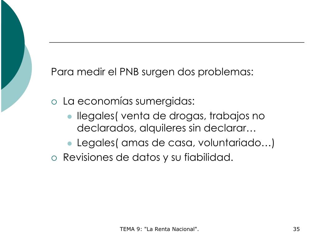 Para medir el PNB surgen dos problemas: • La economías sumergidas: • Ilegales( venta de drogas, trabajos no declarados, alquileres sin declarar… • Legales( amas de casa, voluntariado…) • Revisiones de datos y su fiabilidad. TEMA 9: "La Renta Nacional".
