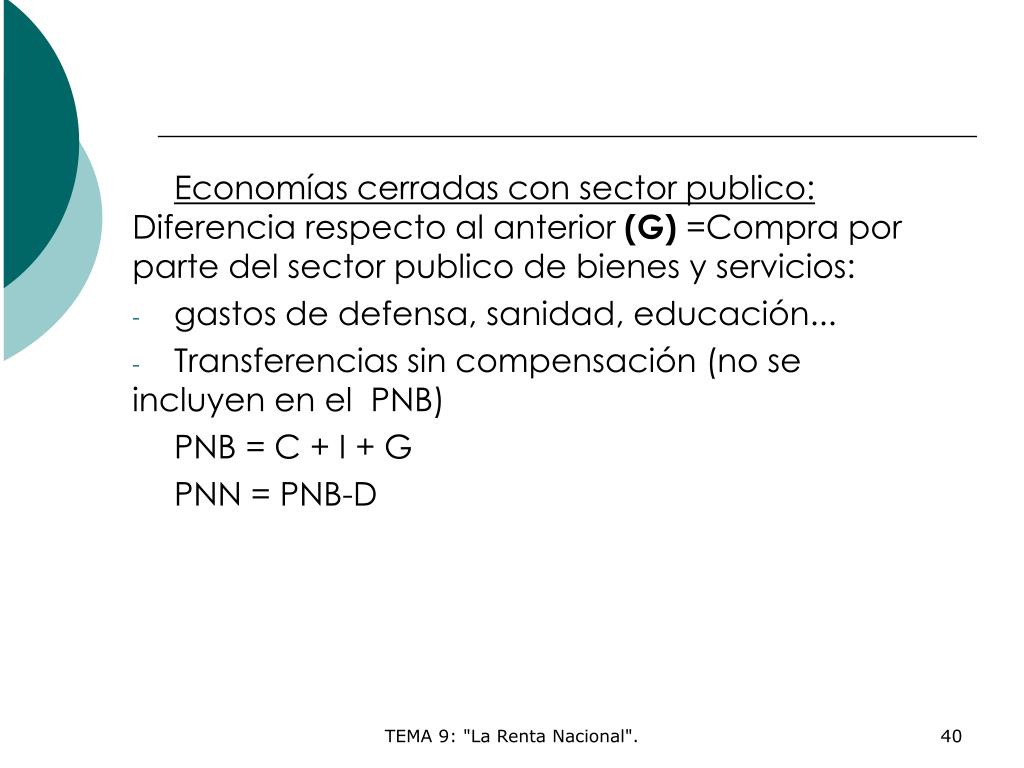 Economías cerradas con sector publico: Diferencia respecto al anterior (G) =Compra por parte del sector publico de bienes y servicios: • gastos de defensa, sanidad, educación... • Transferencias sin compensación (no se incluyen en el PNB) PNB = C + I + G PNN = PNB-D TEMA 9: "La Renta Nacional".