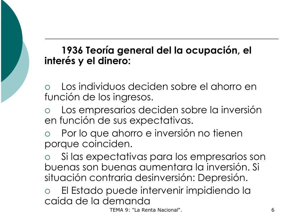 1936 Teoría general del la ocupación, el interés y el dinero: • Los individuos deciden sobre el ahorro en función de los ingresos. • Los empresarios deciden sobre la inversión en función de sus expectativas. • Por lo que ahorro e inversión no tienen porque coinciden. • Si las expectativas para los empresarios son buenas son buenas aumentara la inversión. Si situación contraria desinversión: Depresión. • El Estado puede intervenir impidiendo la caida de la demanda TEMA 9: "La Renta Nacional".