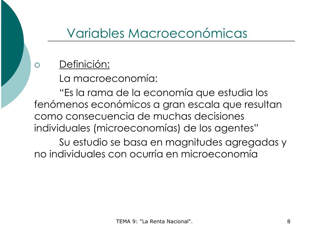 Variables Macroeconómicas • Definición: La macroeconomía: “Es la rama de la economía que estudia los fenómenos económicos a gran escala que resultan como consecuencia de muchas decisiones individuales (microeconomías) de los agentes” Su estudio se basa en magnitudes agregadas y no individuales con ocurría en microeconomía TEMA 9: "La Renta Nacional".