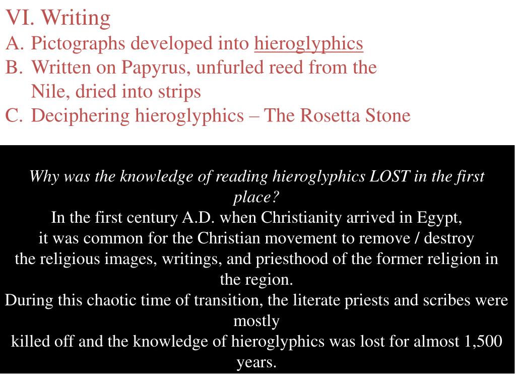 VI. Writing • Pictographs developed into hieroglyphics • Written on Papyrus, unfurled reed from the Nile, dried into strips • Deciphering hieroglyphics – The Rosetta Stone Why was the knowledge of reading hieroglyphics LOST in the first place? In the first century A.D. when Christianity arrived in Egypt, it was common for the Christian movement to remove / destroy the religious images, writings, and priesthood of the former religion in the region. During this chaotic time of transition, the literate priests and scribes were mostly killed off and the knowledge of hieroglyphics was lost for almost 1,500 years.