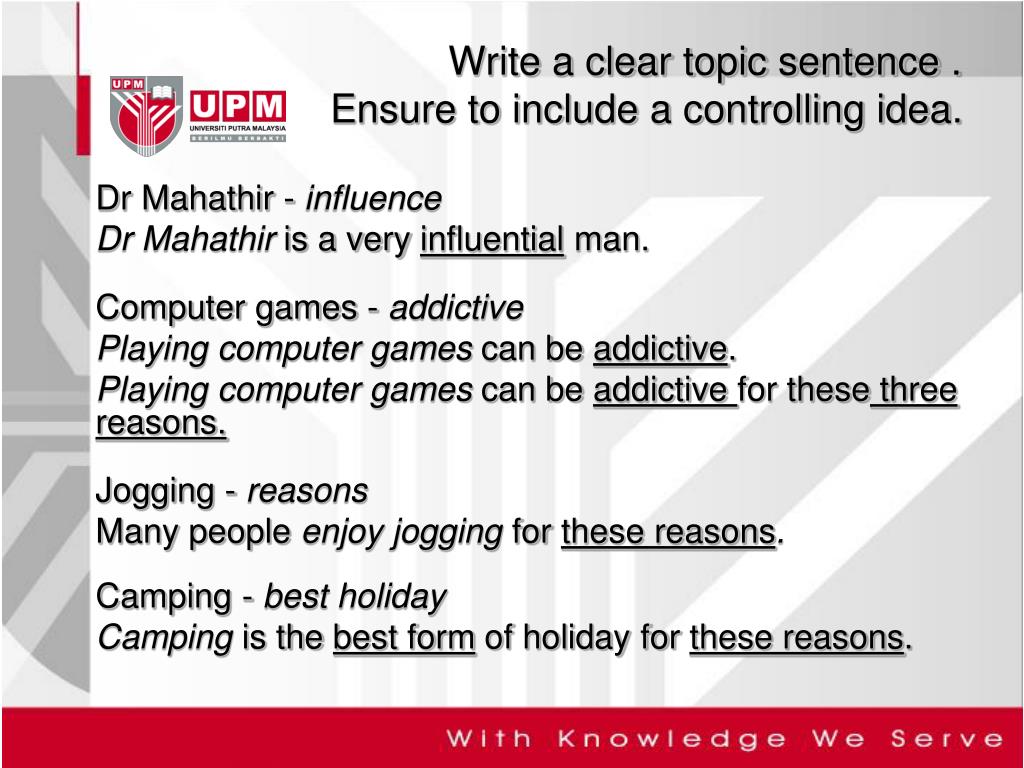 Dr Mahathir - influence Dr Mahathir is a very influential man. Computer games - addictive Playing computer games can be addictive. Playing computer games can be addictive for these three reasons. Jogging - reasons Many people enjoy jogging for these reasons. Camping - best holiday Camping is the best form of holiday for these reasons. Write a clear topic sentence . Ensure to include a controlling idea.