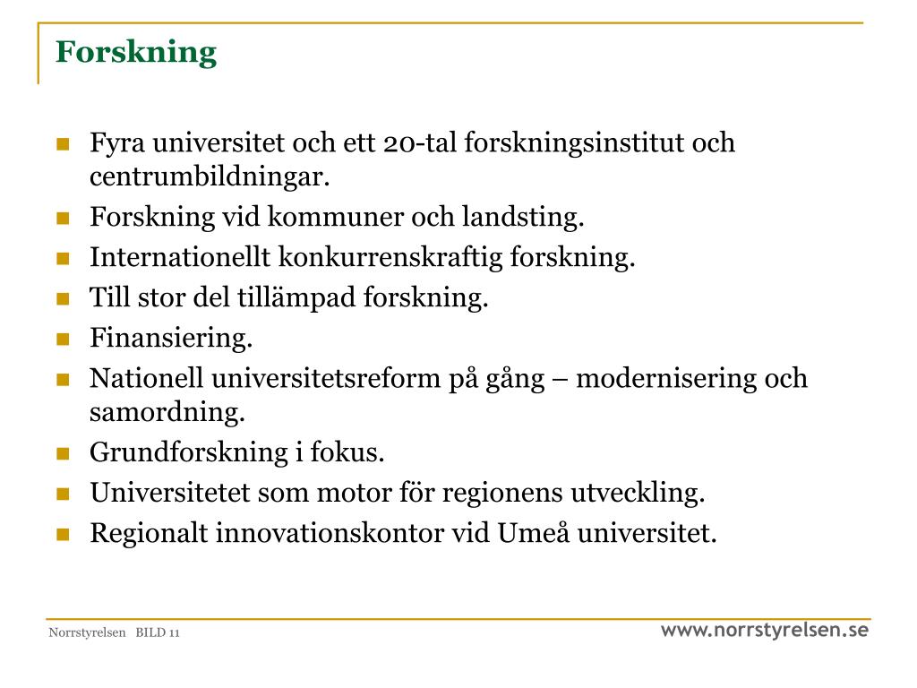 Forskning • Fyra universitet och ett 20-tal forskningsinstitut och centrumbildningar. • Forskning vid kommuner och landsting. • Internationellt konkurrenskraftig forskning. • Till stor del tillämpad forskning. • Finansiering. • Nationell universitetsreform på gång – modernisering och samordning. • Grundforskning i fokus. • Universitetet som motor för regionens utveckling. • Regionalt innovationskontor vid Umeå universitet. Norrstyrelsen BILD 11