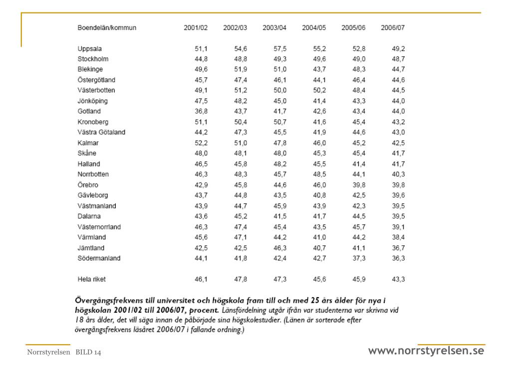 Högre utbildning • Infrastruktur för lärande – livslångt lärande och kompetensförsörjning. • Många aktörer – kommuner, kommunförbund, kommunalförbund, landsting, länsstyrelser, arbetsförmedlingen, folkhögskolor, utbildningsanordnare. • Fyra universitet i regionen. • Regionens kompetensförsörjning måste säkerställas. • En viktig rekryteringsbas. • Ökad utbildningsnivå. • Ökad övergången till högre studier • Goda samarbeten • Idag en oklar regional nivå… arbetsförmedlingens avregionalisering • Tillgång till decentraliserad utbildning och distansutbildning • Universitetens utbildningsprofil • Rekryteringsbas – konkurrens kontra komplettering • Samarbete för att säkerställa att utbildningar finns. • Utbildning – lämnar norrland. Viktigt med näringslivskoppling. Norrstyrelsen BILD 16