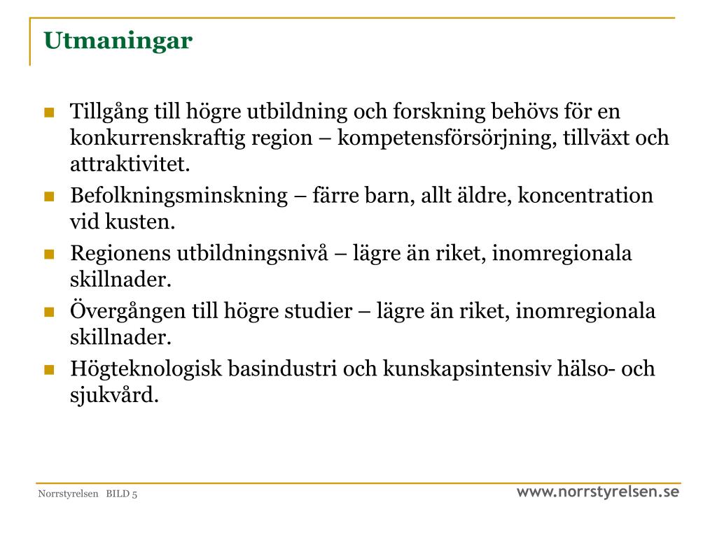 Utmaningar • Tillgång till högre utbildning och forskning behövs för en konkurrenskraftig region – kompetensförsörjning, tillväxt och attraktivitet. • Befolkningsminskning – färre barn, allt äldre, koncentration vid kusten. • Regionens utbildningsnivå – lägre än riket, inomregionala skillnader. • Övergången till högre studier – lägre än riket, inomregionala skillnader. • Högteknologisk basindustri och kunskapsintensiv hälso- och sjukvård. Norrstyrelsen BILD 5