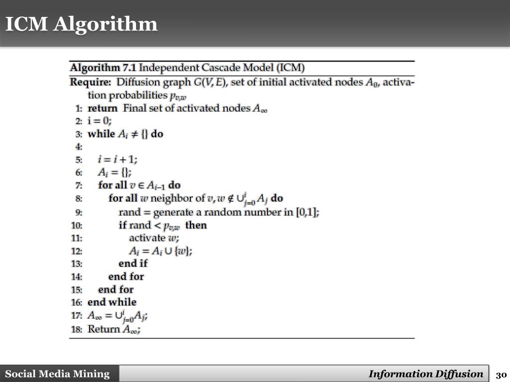 Independent Cascade Model (ICM) • Independent Cascade Model is a sender centric model of cascade • In this model each node has one chance to activate its neighbors • Considering nodes that are active as senders and nodes that are being activated as receivers, • The linear threshold model concentrates on the receiver (to be discussed later). • The independent cascade model concentrates on the sender