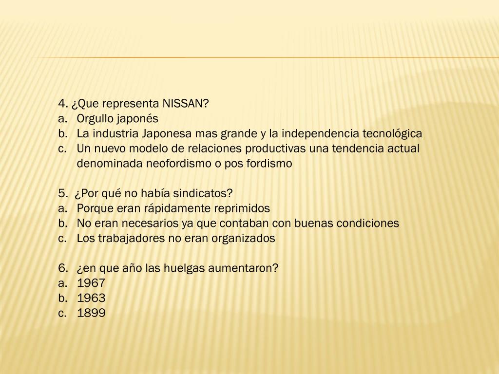 4. ¿Que representa NISSAN? Orgullo japonés La industria Japonesa mas grande y la independencia tecnológica Un nuevo modelo de relaciones productivas una tendencia actual denominada neofordismo o pos fordismo 5. ¿Por qué no había sindicatos? Porque eran rápidamente reprimidos No eran necesarios ya que contaban con buenas condiciones Los trabajadores no eran organizados ¿en que año las huelgas aumentaron? 1967 1963 1899