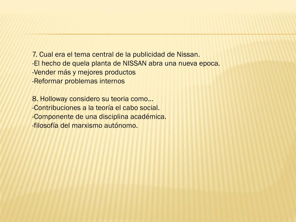 7. Cual era el tema central de la publicidad de Nissan. -El hecho de quela plantade NISSAN abra una nueva epoca. -Vender más y mejores productos -Reformar problemas internos 8. Hollowayconsidero su teoria como… -Contribuciones a la teoría el cabo social. -Componente de una disciplina académica. -filosofía del marxismo autónomo.