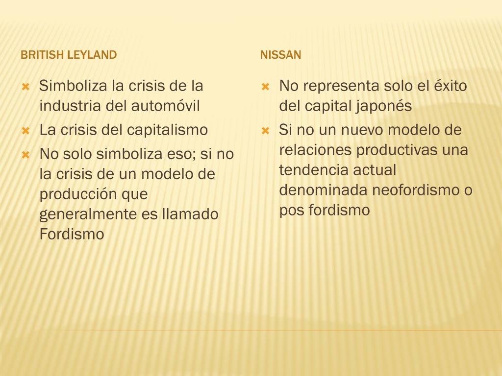 British Leyland NISSAN • Simboliza la crisis de la industria del automóvil • La crisis del capitalismo • No solo simboliza eso; si no la crisis de un modelo de producción que generalmente es llamado Fordismo • No representa solo el éxito del capital japonés • Si no un nuevo modelo de relaciones productivas una tendencia actual denominada neofordismo o pos fordismo
