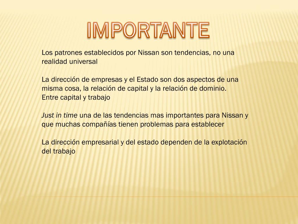 IMPORTANTE Los patrones establecidos por Nissan son tendencias, no una realidad universal La dirección de empresas y el Estado son dos aspectos de una misma cosa, la relación de capital y la relación de dominio. Entre capital y trabajo Just in time una de las tendencias mas importantes para Nissan y que muchas compañías tienen problemas para establecer La dirección empresarial y del estado dependen de la explotación del trabajo