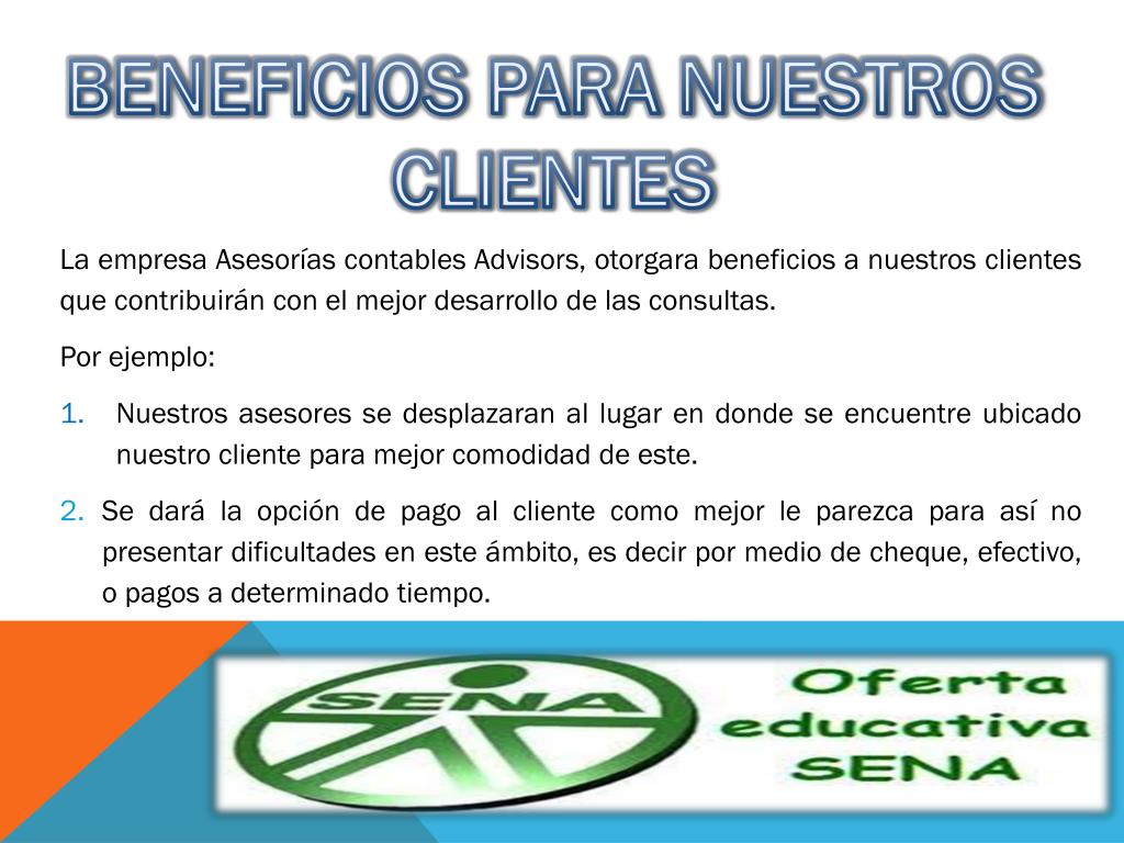 BENEFICIOS PARA NUESTROS • CLIENTES • La empresa Asesorías contables Advisors, otorgara beneficios a nuestros clientes que contribuirán con el mejor desarrollo de las consultas. • Por ejemplo: • Nuestros asesores se desplazaran al lugar en donde se encuentre ubicado nuestro cliente para mejor comodidad de este. • Se dará la opción de pago al cliente como mejor le parezca para así no presentar dificultades en este ámbito, es decir por medio de cheque, efectivo, o pagos a determinado tiempo.