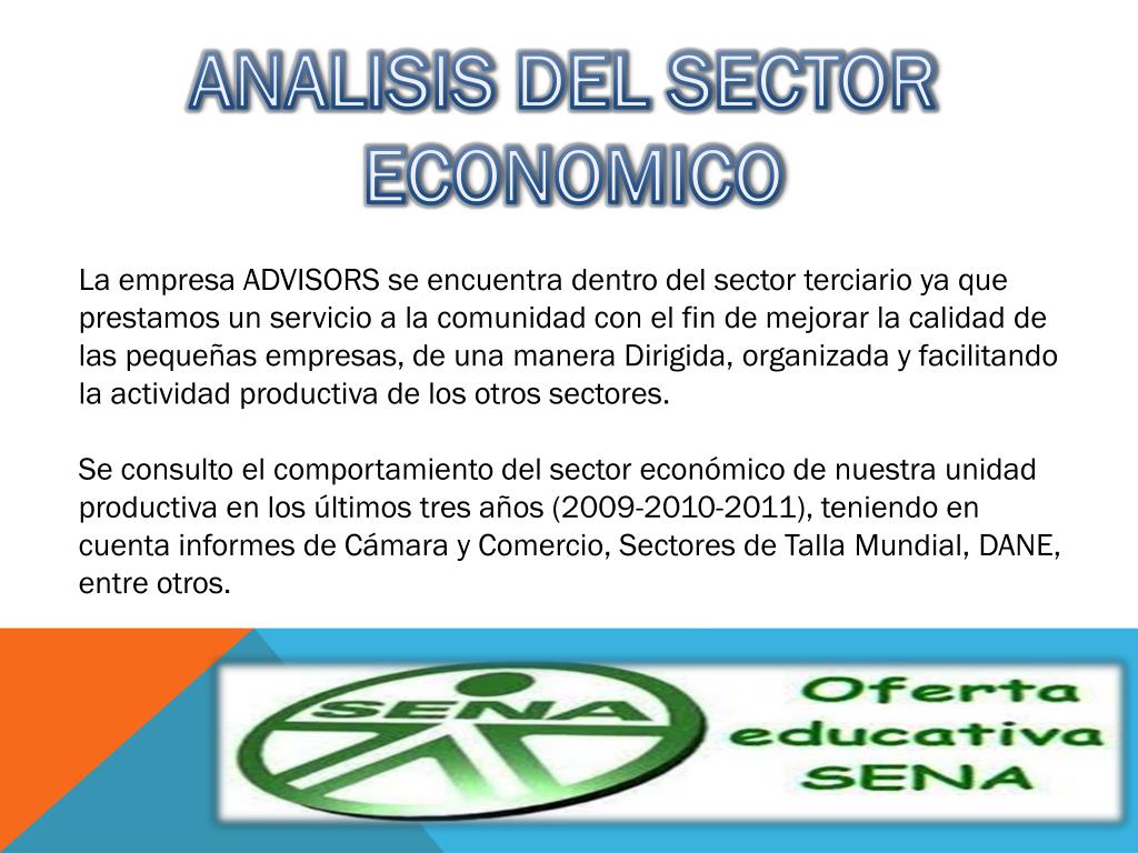 ANALISIS DEL SECTOR ECONOMICO La empresa ADVISORS se encuentra dentro del sector terciario ya que prestamos un servicio a la comunidad con el fin de mejorar la calidad de las pequeñas empresas, de una manera Dirigida, organizada y facilitando la actividad productiva de los otros sectores. Se consulto el comportamiento del sector económico de nuestra unidad productiva en los últimos tres años (2009-2010-2011),teniendo en cuenta informes de Cámara y Comercio, Sectores de Talla Mundial, DANE, entre otros.